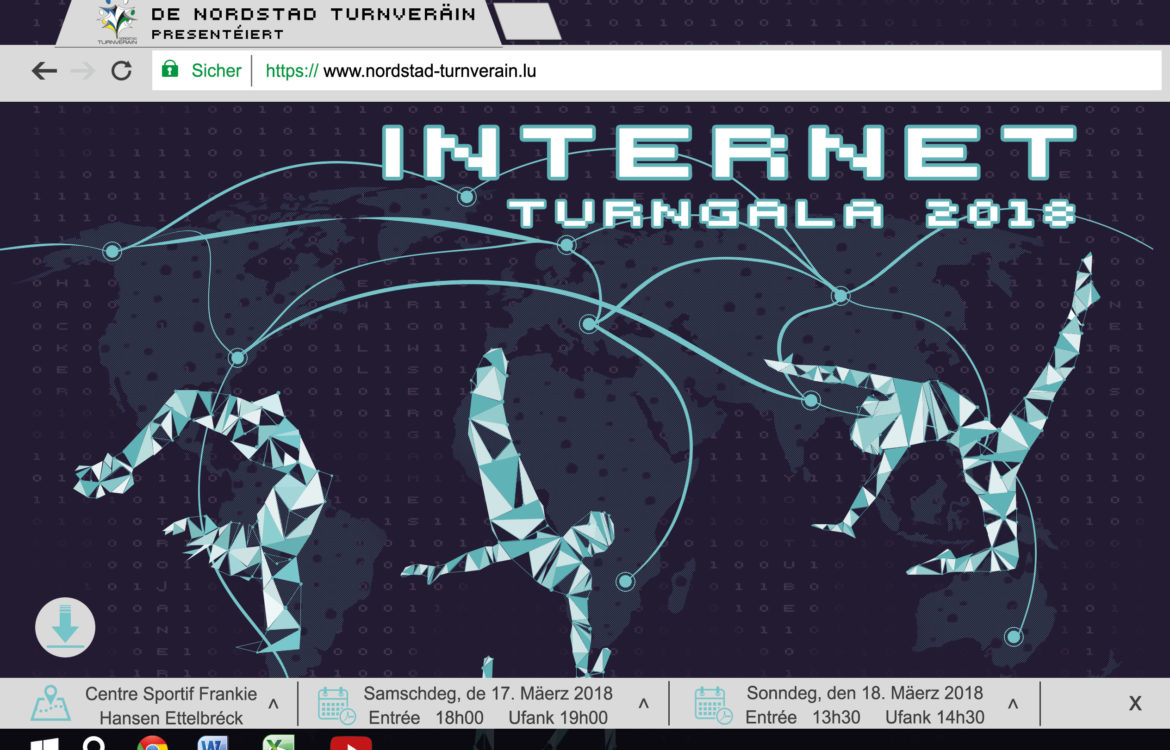 De 17. an 18. Mäerz 2018 fënnt eis alljährlech Gala statt. Dëst Joër ënnert dem Motto “WorldWideWeb”. Mat dobäi ëm déi 200 Turner an Turnerinnen an alles wat Turnerhäerz verlaangt. Wou? Centre sportif Frankie Hanasen Ettelbréck Samschdeg Entrée 18h00 Ufank: 19h00 Sonndeg Entrée: 13h30 Ufank: 14h30 Virverkaf: 10 € (Kanner bis 6 Joër si … Lire la suite de Gala 2018 ënnert dem Motto “WorldWideWeb”